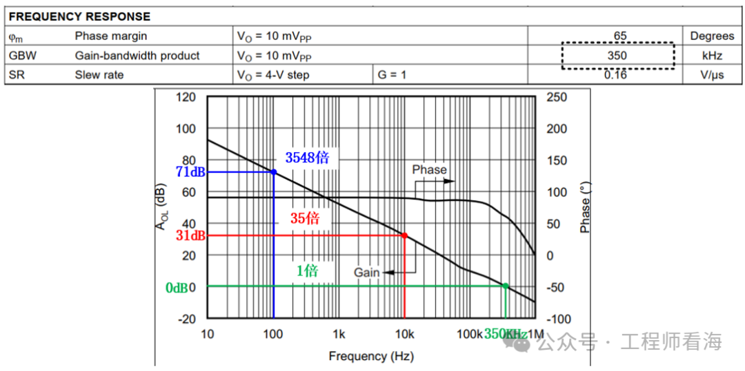 這個(gè)意思是OPA2333的開(kāi)環(huán)放大倍數(shù)乘對(duì)應(yīng)的頻率,剛好等于350KHz,我們?cè)趫D中的開(kāi)環(huán)頻率曲線(xiàn)看下,在頻率為100Hz時(shí)的開(kāi)環(huán)增益是71dB,71dB的放大倍數(shù)是3548倍(dB與放大倍數(shù)的轉(zhuǎn)換參考《運(yùn)放秘籍》第一部:5.1 什么是放大倍數(shù)?增益?開(kāi)環(huán)增益?閉環(huán)增益?),3548*100Hz=354.8KHz,非常接近手冊(cè)中的增益帶寬積350KHz。