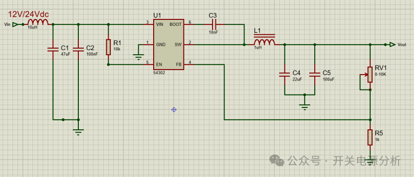 從規(guī)格書中,我們了解到芯片的輸入電源范圍為:4.5V 至 28V;輸出最大持續(xù)電流可達(dá)到3A;輸出電壓范圍為:0.6V至26V;如果對(duì)輸出電壓沒(méi)有硬性要求為0V的情況下,那么這個(gè)設(shè)計(jì)就比較簡(jiǎn)單了,如下圖所示: