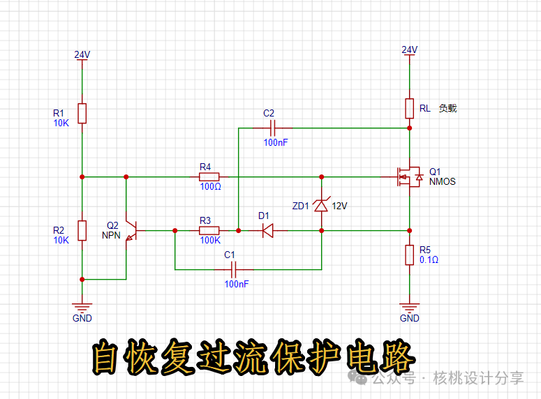 電路只是用于原理講解,實(shí)際應(yīng)用還有待驗(yàn)證!那這個(gè)“自恢復(fù)過流保護(hù)電路”具體的功能原理是什么呢?功能:過流了會(huì)自行斷開負(fù)載,然后隔一段時(shí)間會(huì)自動(dòng)恢復(fù)對負(fù)載的供電,如果負(fù)載還是出現(xiàn)過流現(xiàn)象,那電路還是會(huì)接著斷開負(fù)載供電,如此反復(fù),直到負(fù)載電流正常為止。