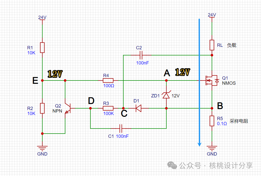 原理:(1)如下圖所示可知,E點(diǎn)的電壓是12V(由R1和R2分壓而得),A點(diǎn)電壓等于E點(diǎn)電壓,也是為12V,所以NMOS管Q1滿足導(dǎo)通要求,負(fù)載RL得電正常工作。