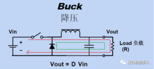 Buck變換器是一種降壓式非隔離開關(guān)電源,當(dāng)開關(guān)管導(dǎo)通時,輸入電源通過電感給輸出供電,同時電感存儲能量;當(dāng)開關(guān)管關(guān)斷時,電感通過續(xù)流二極管給輸出供電;如此反復(fù)即可維持輸出產(chǎn)生一個恒定的電壓。