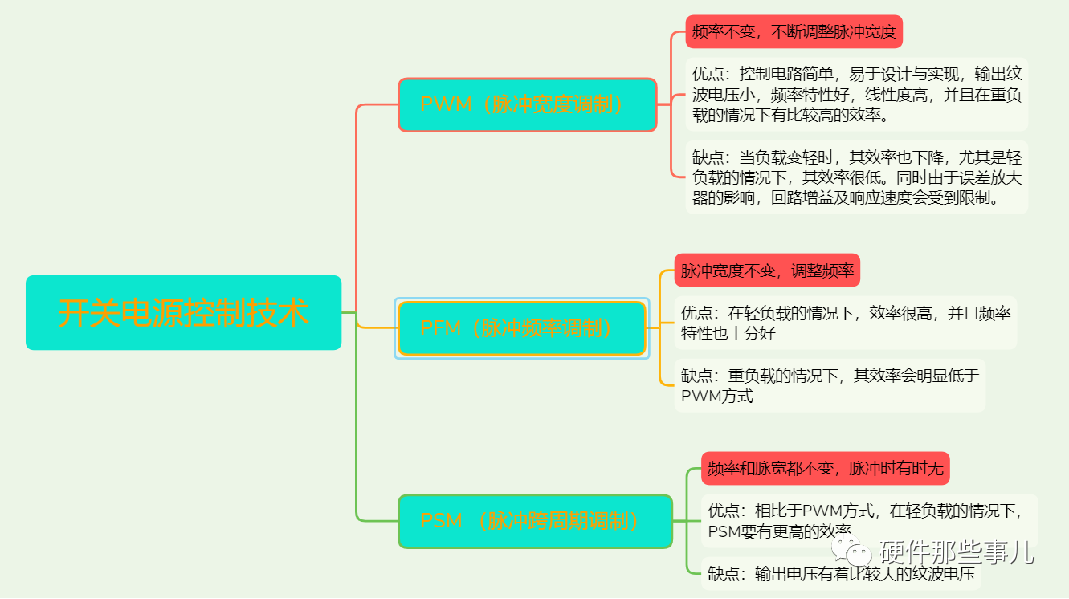 說明:以上幾種控制方式中PWM占主流。但現(xiàn)在有些新的電源控制器,為了提高輕載到重載全部工況的電源效率,通過同時支持PWM和PFM兩種工作模式,來提供全時效率。很多電路中通常都選擇PWM與PFM或者PSM相結(jié)合的方式,以保證系統(tǒng)在整個負(fù)載范圍內(nèi)都有比較高的效率。