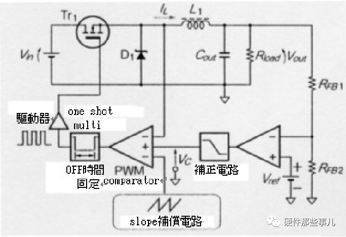 固定ON/OFF時間控制:下圖是固定ON/OFF時間控制的電流模式DC-DC Converter電路,由圖可知開關(guān)管Tr1一旦導(dǎo)通,電感電流IL會大幅增加。如果反饋后的電感電流比控制信號更大的話,開關(guān)管會在固定時間點關(guān)斷,之后開關(guān)管再導(dǎo)通,即通過開關(guān)頻率的變化(變頻)來調(diào)節(jié)輸出電壓。優(yōu)點是固定ON/OFF時間控制的電流模式控制結(jié)構(gòu)上非常簡潔;缺點是工作頻率是變化的,因此輸入輸出濾波器的設(shè)計比較復(fù)雜。