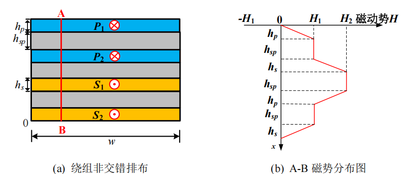 圖 (b)為非交錯(cuò)排布結(jié)構(gòu) A-B 磁勢分布圖,由圖可知,沿原邊繞組 P1 厚度方向磁勢不斷增大,在 P1 和 P2 中間的絕緣層中,磁勢大小達(dá)到 H1 且保持不變。然后沿著原邊繞組 P2 厚度方向磁勢又不斷增大,在 P2 和 S1 中間的絕緣層磁勢達(dá)到最大 H2 并保持不變。而后沿副邊繞組 S1 厚度方向,由于副邊繞組電流方向與原邊繞組相反,故磁勢開始減小。在 S1和 S2 中間的絕緣層中,由于沒有電流流動(dòng),故磁勢保持 H1 不變。最后沿著副邊繞組 S2 厚度方向磁勢不斷減小,最終磁勢降為零。整個(gè)過程,經(jīng)過原邊繞組時(shí),電流為正方向,磁勢不斷上升;沿著副邊繞組時(shí),電流為反方向,磁勢不斷減??;在絕緣層中,無電流流動(dòng),磁勢保持不變。結(jié)合安培環(huán)路定理和圖 磁勢分布圖,可以得到非交錯(cuò)排布結(jié)構(gòu)變壓器工作時(shí)各繞組上的磁場強(qiáng)度為: