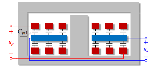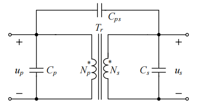 下圖給出了平面變壓器寄生電容等效模型,其中 up 為原邊繞組電壓,us 為副邊繞組電壓,Cp 為原邊平面繞組間的寄生電容,Cs 為副邊平面繞組間的寄生電容,Cps 為原邊繞組與副邊繞組間的寄生電容。