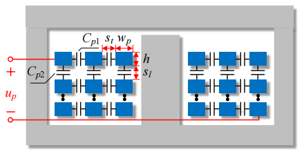 原邊繞組內(nèi)分布電容示意圖,其中 Cp1為匝間分布電容,Cp2為層間分布電容,st 為平面繞組匝間間距,sl 為平面繞組層間間距,wp 為平面繞組每匝寬度,h 為繞組厚度。