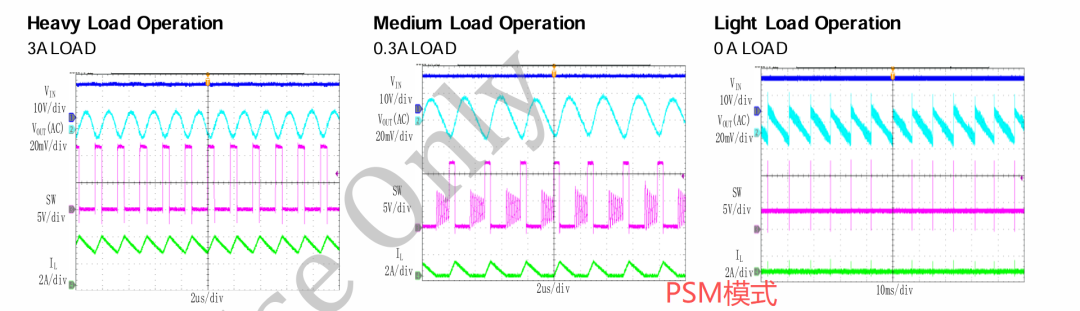 圖5:PSM模式下不同負(fù)載時(shí)SW引腳波形
