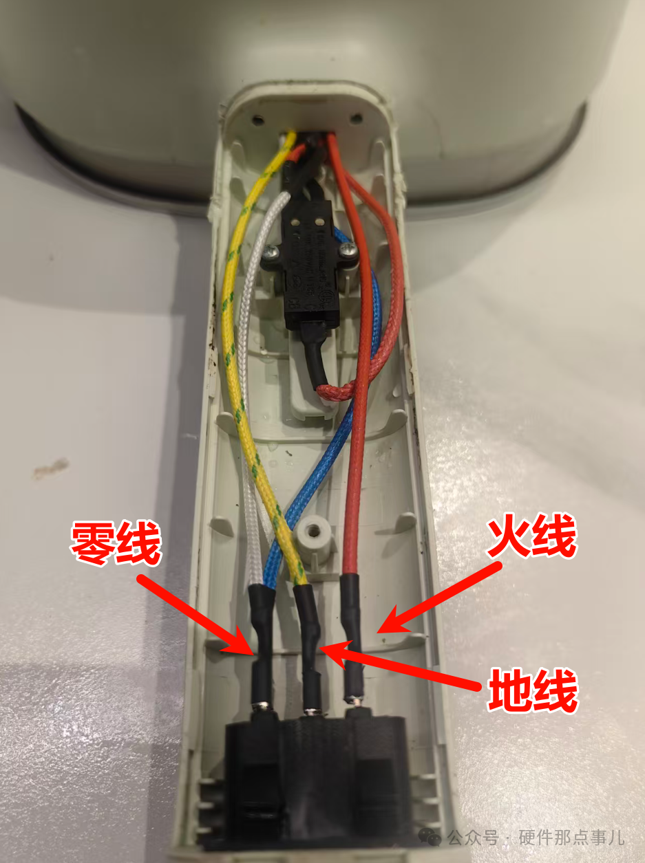 映入眼簾的就是咱們熟悉的火線,零線,地線了。上面那個黑色的是滑動開關(guān),用于調(diào)節(jié)關(guān)->一檔->二檔。