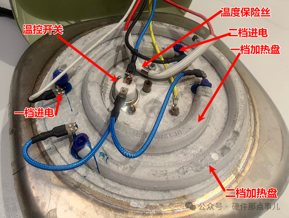 白色的就是溫控開關(guān)了,我們整體看下來,會發(fā)現(xiàn),這鍋里沒有出現(xiàn)一個PCB板子,也沒電阻,電容,單片機,那它是怎么控溫的呢?答案就是溫控開關(guān),你看一檔加熱盤和二檔加熱盤的回路都會經(jīng)過溫控開關(guān)。