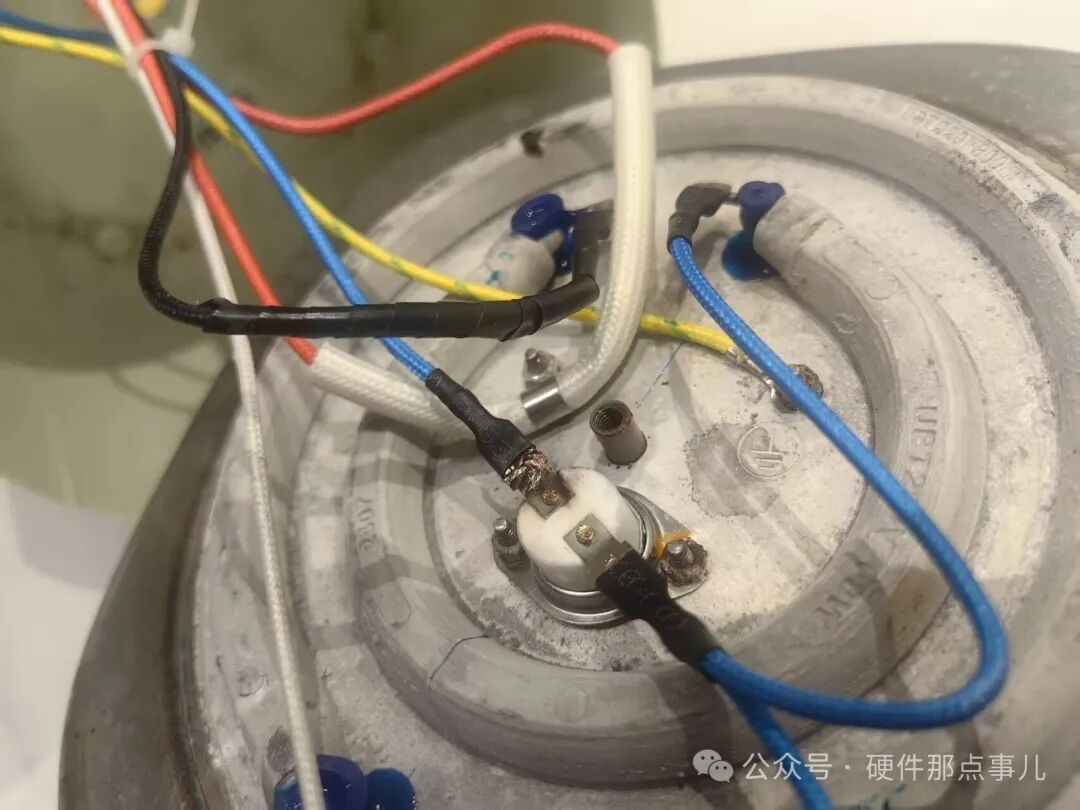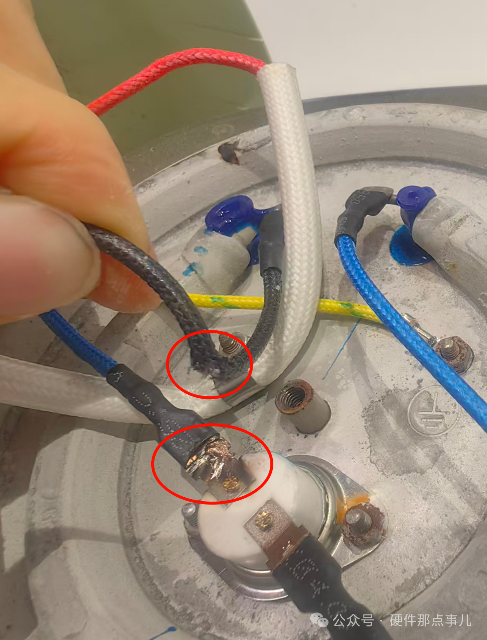 再仔細一看,原來是二檔進電的線(L線),也就是下圖的黑線線皮出現(xiàn)了破損,和溫控開關(guān)的出線(N線)端子這發(fā)生了接觸,從而導致的短路。