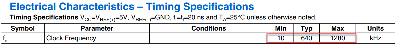 3)轉(zhuǎn)換時間為100μs(時鐘為640KHz時),130μs(時鐘為500KHz時)。