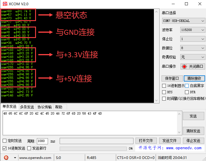 我們用杜邦線將IN0與板子上的GND、3.3V、5V依次相連,串口助手輸出結(jié)果如下: