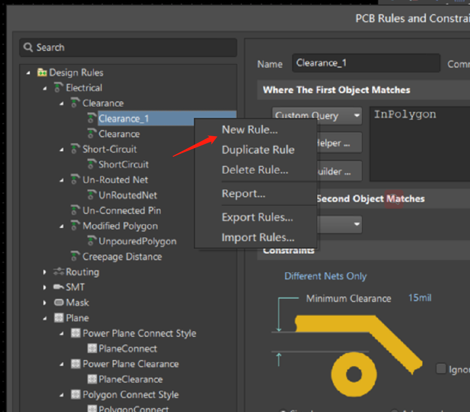 在設計PCB時,其規(guī)則設置很重要,今天分享一個自己添加規(guī)則鋪銅與其它網(wǎng)表的最小間距設置。
